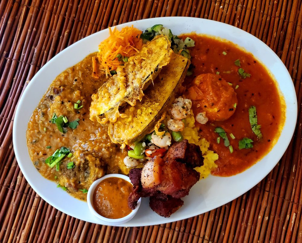 「アッサム風ローストポーク バジルチャツネ」「小エビと枝豆」「ナスのパコラ」「にんじん」そして「キュウリ」のアチャールを、ターメリック日本米の上に盛り付けました。