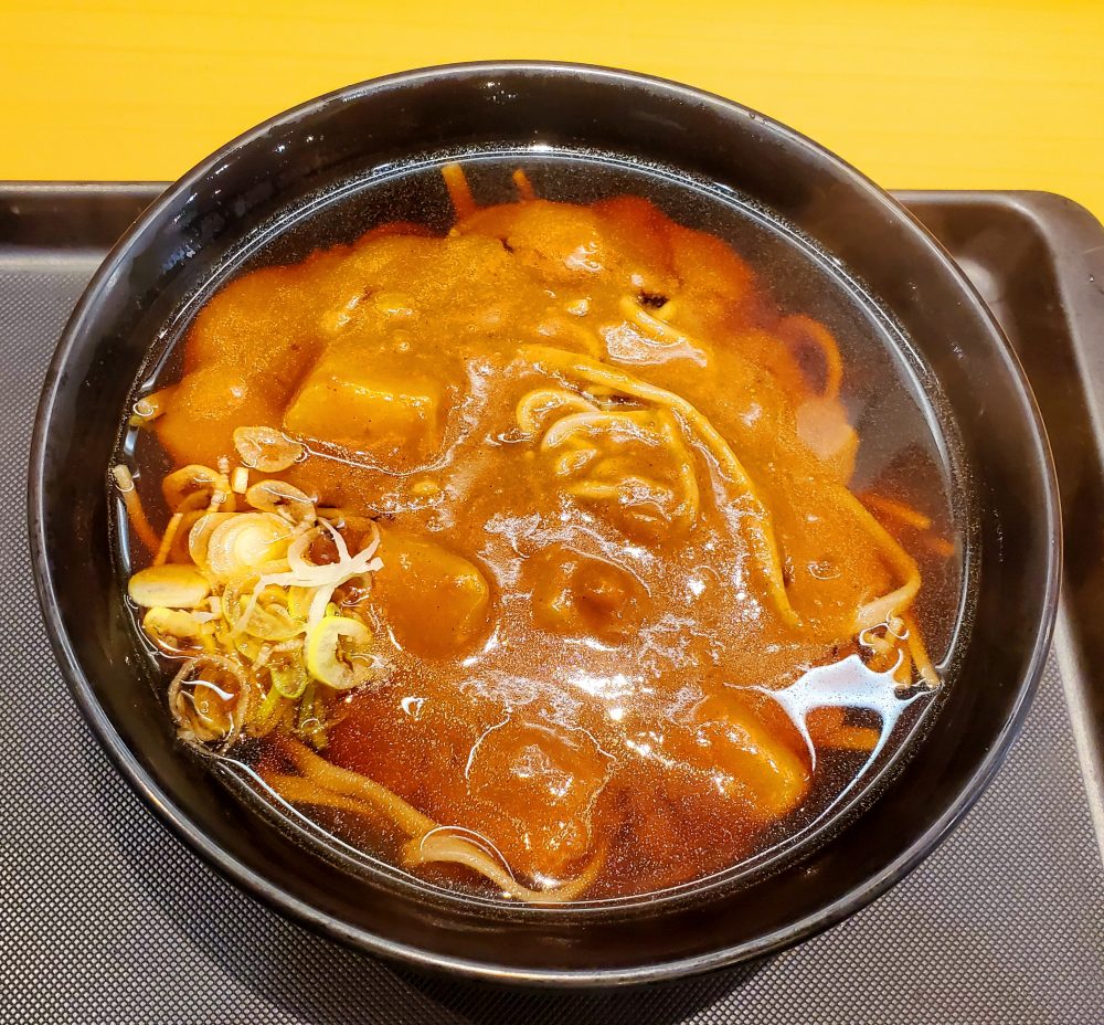 その日は打ち合わせなどが重なり、気が付くと2時を過ぎていて、その後も予定があり、さっと済まされる立ち食いそば店で「カレーそば」を。