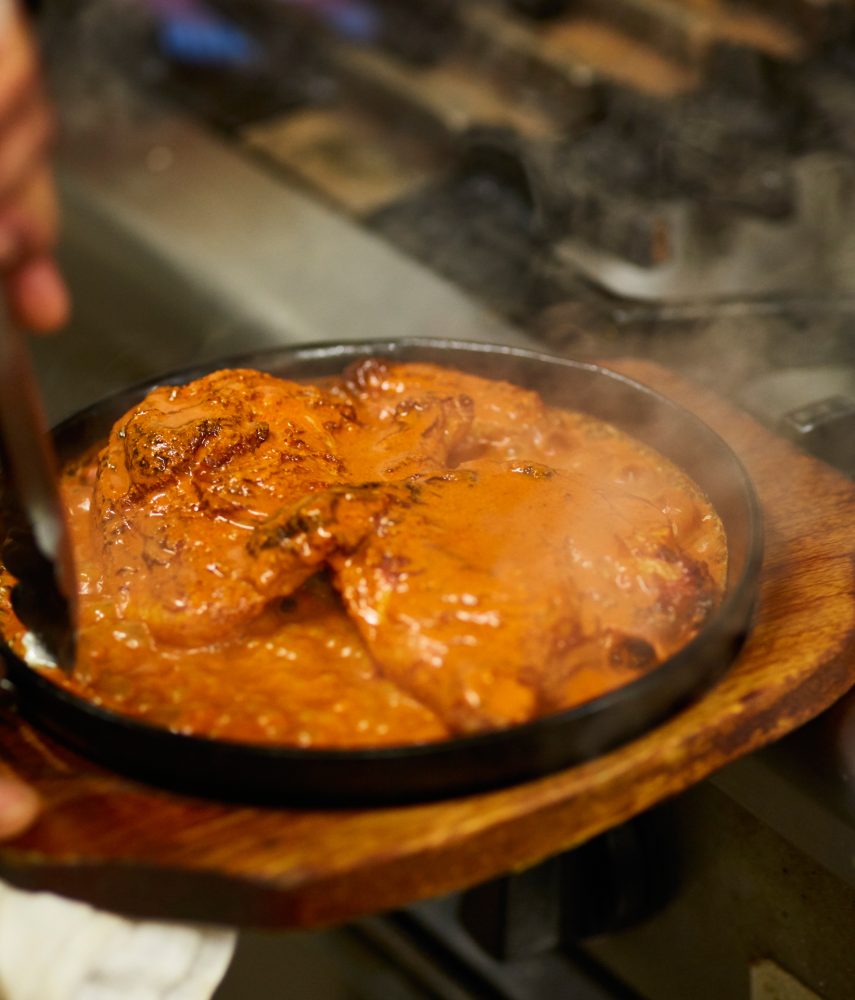 インドではドライなローストチキンタイプですが、デリーはタンドーリソースを注ぎ、鉄板の上でジュージュー音をさせながらご提供します。