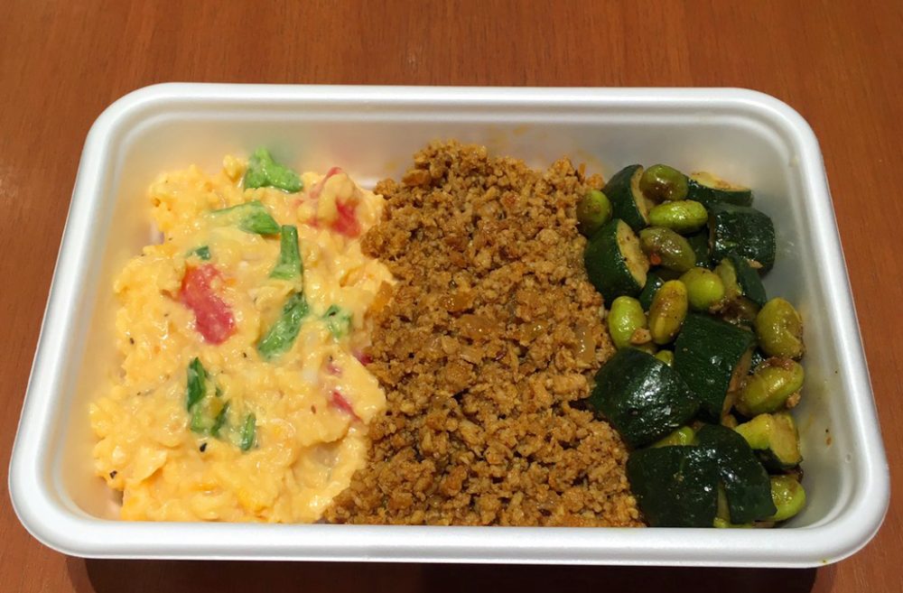 その時は、鶏そぼろ、いり卵、さやいんげんでしたが、ミッドタウンでは、マサラオムレツ、ビーフキーマ、ズッキーニとえだ豆のサブジでした。