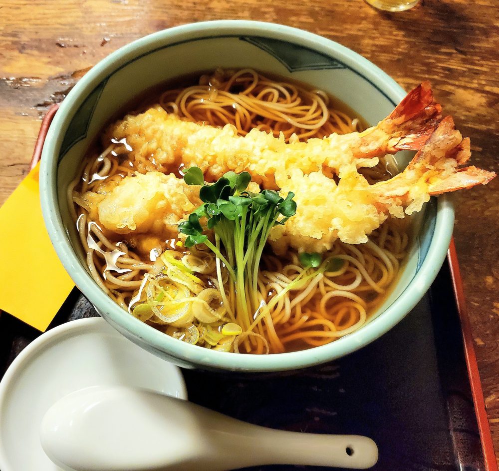 味? やはり好みというか、望みは固めの蕎麦に、胡麻油で揚げた熱々で、しっぽの先を切ってあるそこそこ大きめの衣を纏った車海老の天ぷら、青味がそえられ、熱いかけつゆのものかな。