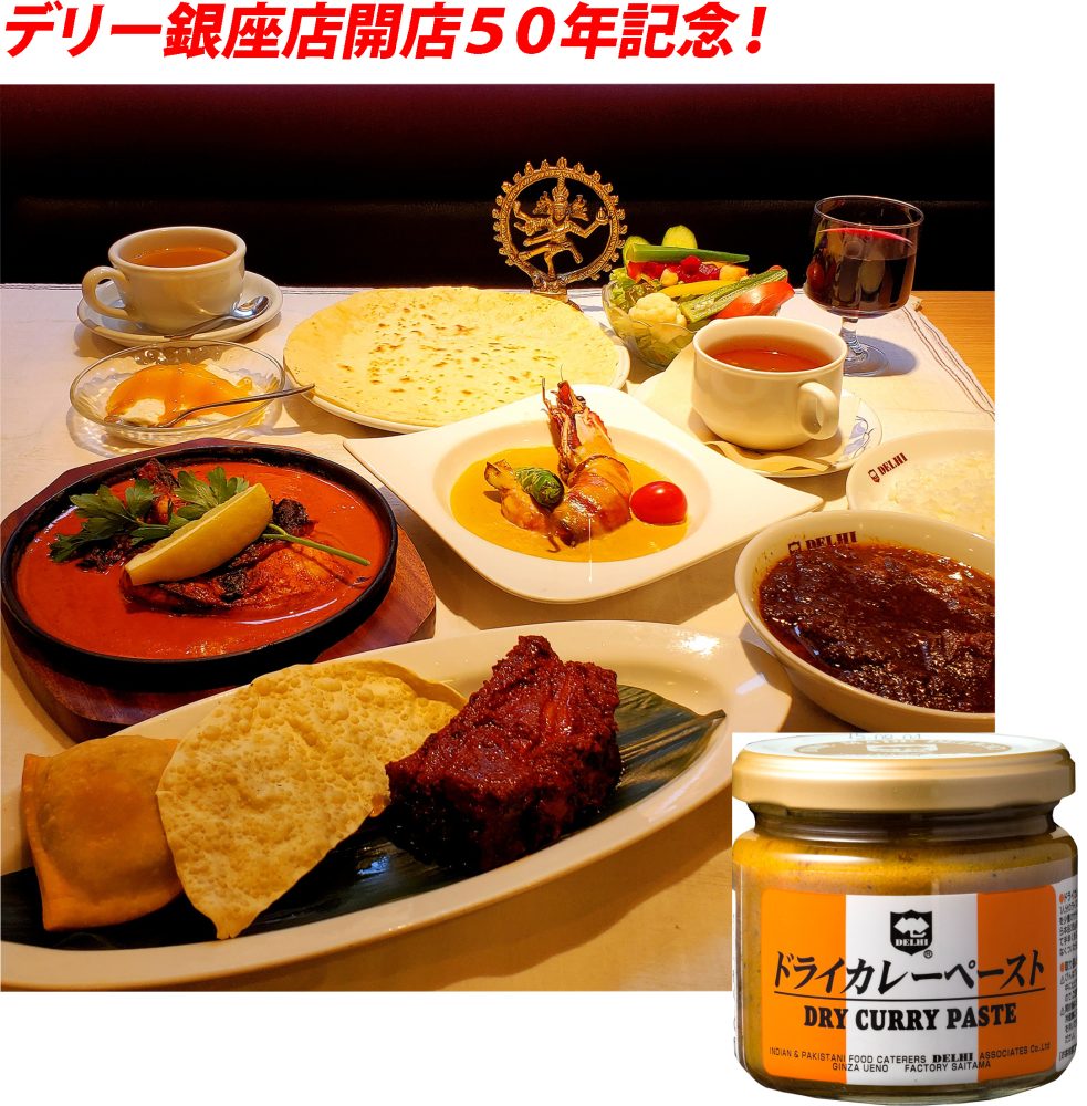 そこで日頃のご愛顧を感謝して、銀座店の人気メニューを集めた「銀座デリーディナーコース」(お一人さま¥5100税込み)に、人気のインドパンのクルチャ(¥590)とお土産に、ドライカレーペースト140g(¥780)をお付けして、総額¥6470を¥5000でご提供いたします。