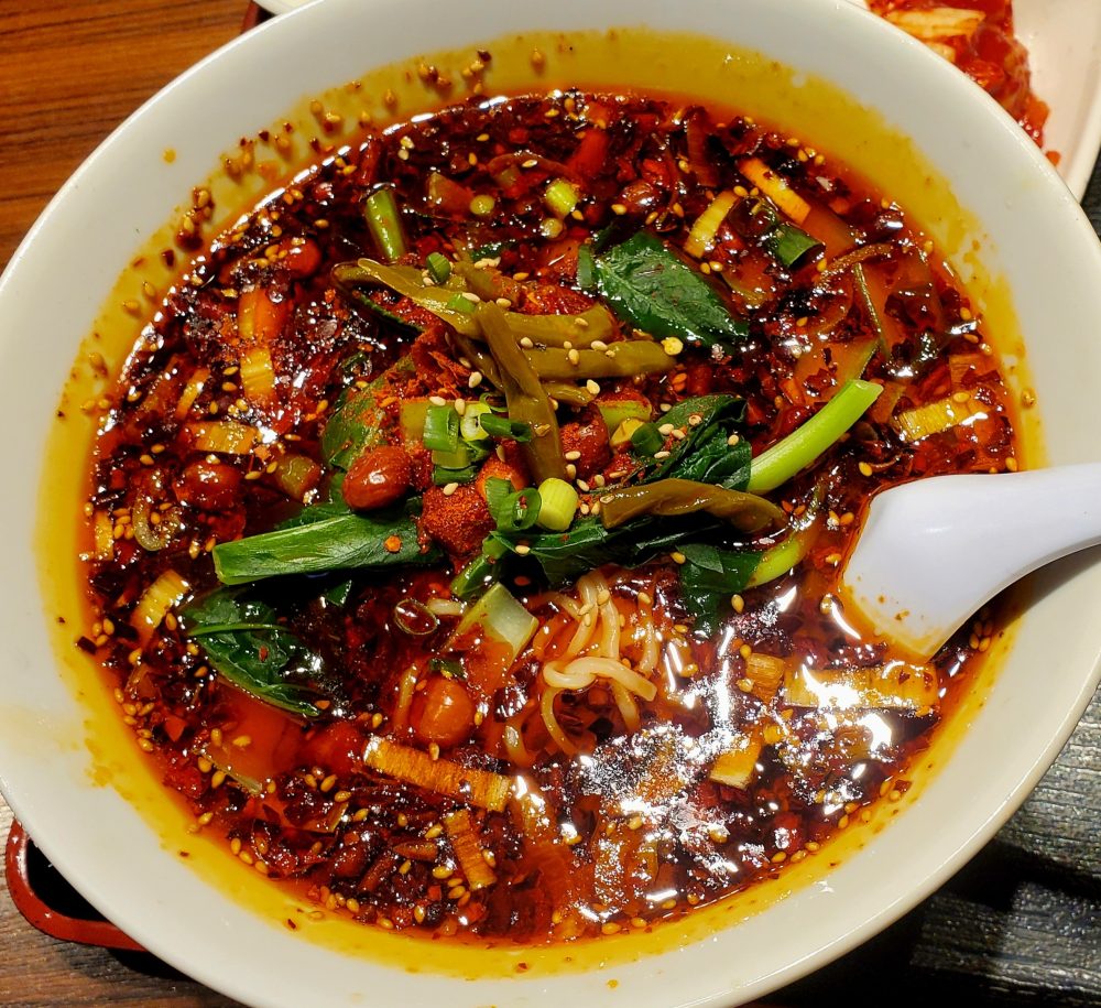 社長雑談 2025.12.05 回想、お気に入りランチ 今年食べたランチで、インパクトがあったのが、この麻辣湯麺でしたか。 辛いというより、唐辛子の強い薫りと、花椒の痺れと香りがきて、ただ辛いだけでなく、頭が痒くなる感覚が面白い。 風邪の引き初めの体に熱がこもってるのに汗も出ない時、首から肩が固い時に、食前に葛根湯を飲み、この麺やカシミールカレーを食べれば、大発汗して、弱い風邪なら抜けられそうです。 今風邪が流行ってますから、引き初めに試してみては。