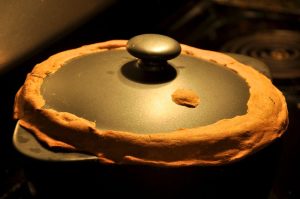 この閉じてるものは、小麦粉を水で練ったものですが、表題カレー画像のように小麦粉のみで蓋をする場合は、その蓋も食べられるようにパン生地(ナンなど)を使います。