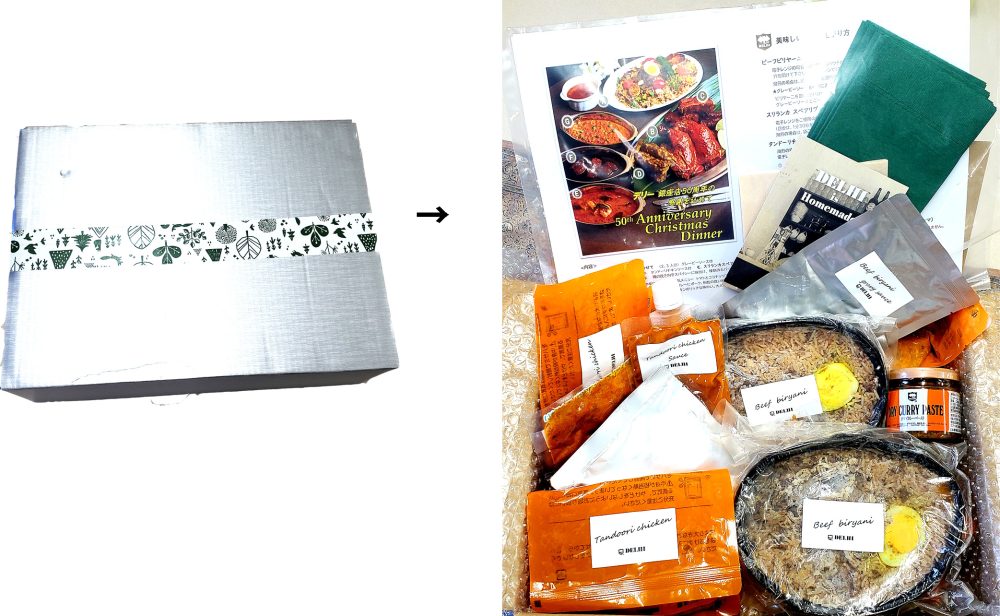 タンドーリチキンレッグ、鴨シークカバーブ、スリランカンスペアリブが各3本に、ビーフビリヤニ450gが2パック(グレイビーソース付き)、バターチキンキーマ、カシミールカレー、そして濃厚なエビカレーというラインアップです。