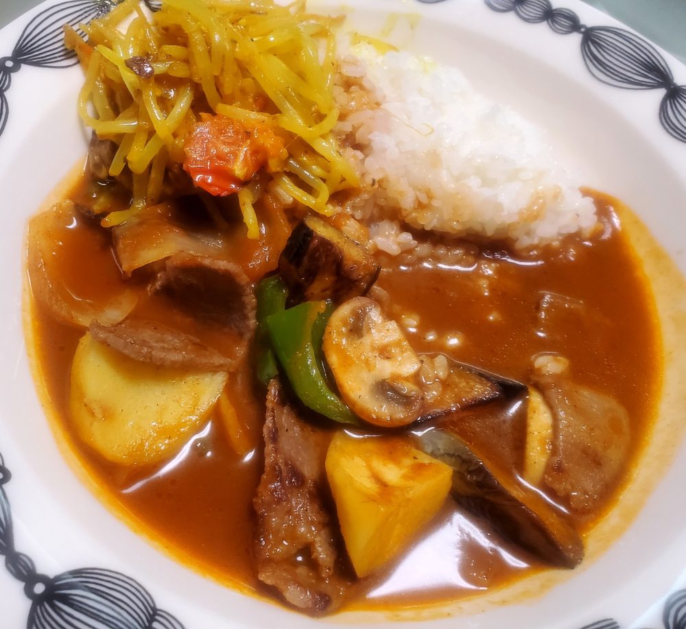 炒めたっぷり野菜類を、少量のスライスビーフと共に「デリーのベンガルカレー」に。