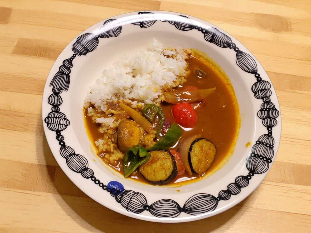 初めは「マッシュルームカレー」にしようとしたのですが、ナスやらピーマンやらタマネギも入り、ベジカレーになりました。