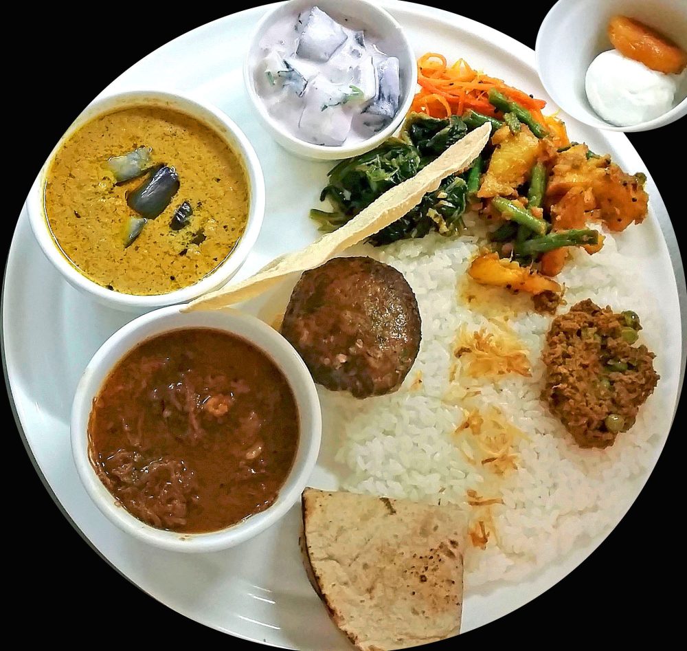 ポークビンダルー、バガラベイガン、カバーブ、サブジ3種に、デザートはアンズとアイスのクッバーニです。