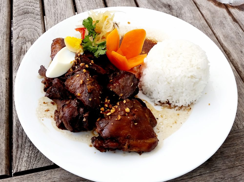 画像はフィリピンのアドボ、鶏肉と豚肉を醤油と酢で煮込んだ料理で、ライスで食べます。