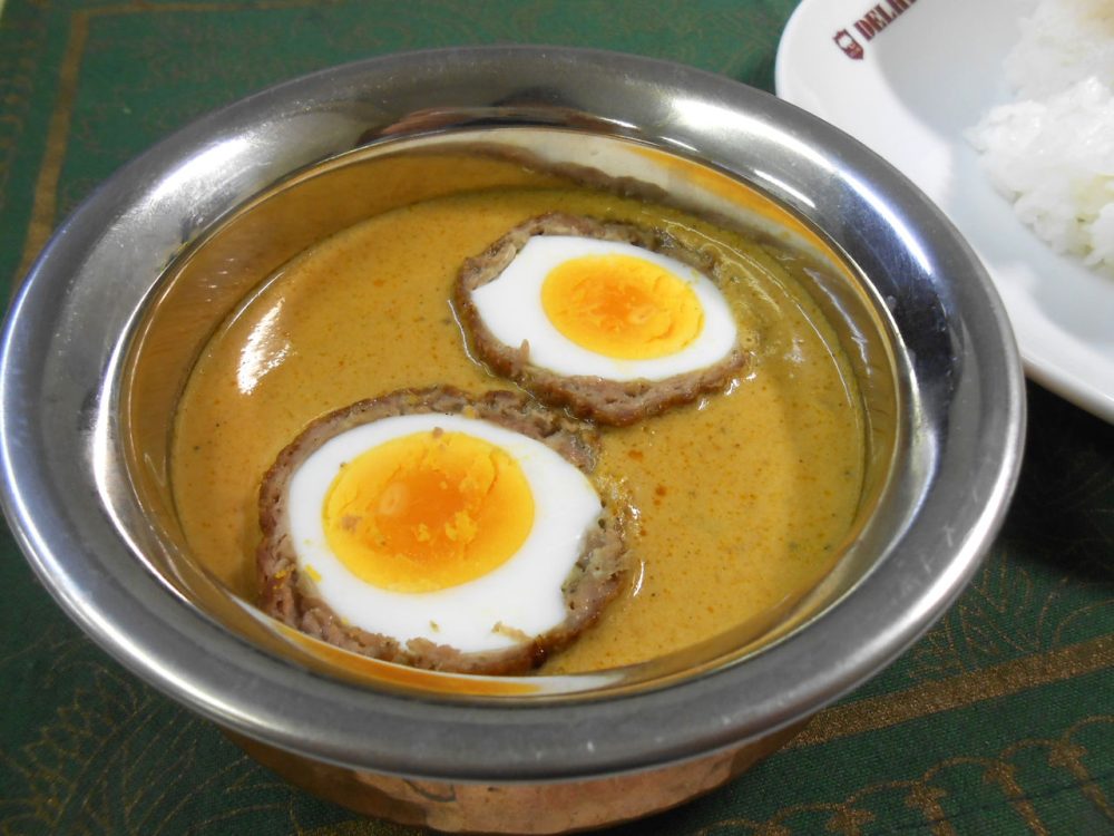 ゆで卵を合い挽き肉でくるみ、パン粉で揚げたもの。