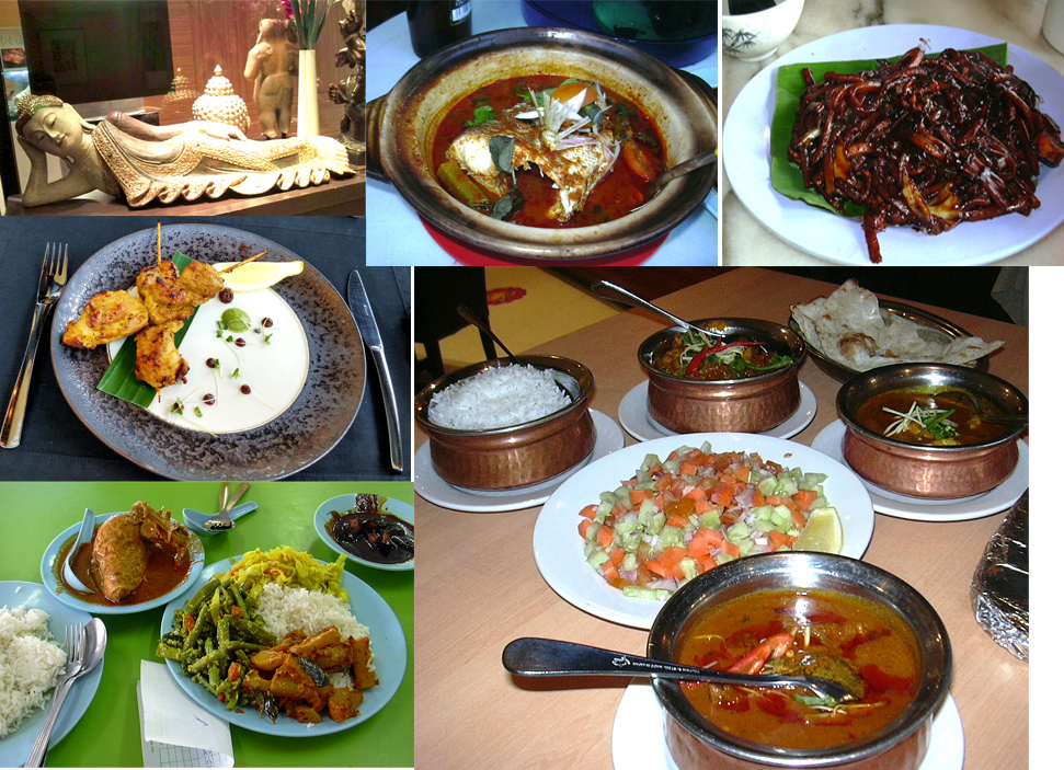 画像上の段はフィッシュヘッドカレーにフライドホッケンミー。2段目左がホテルのインド料理。
