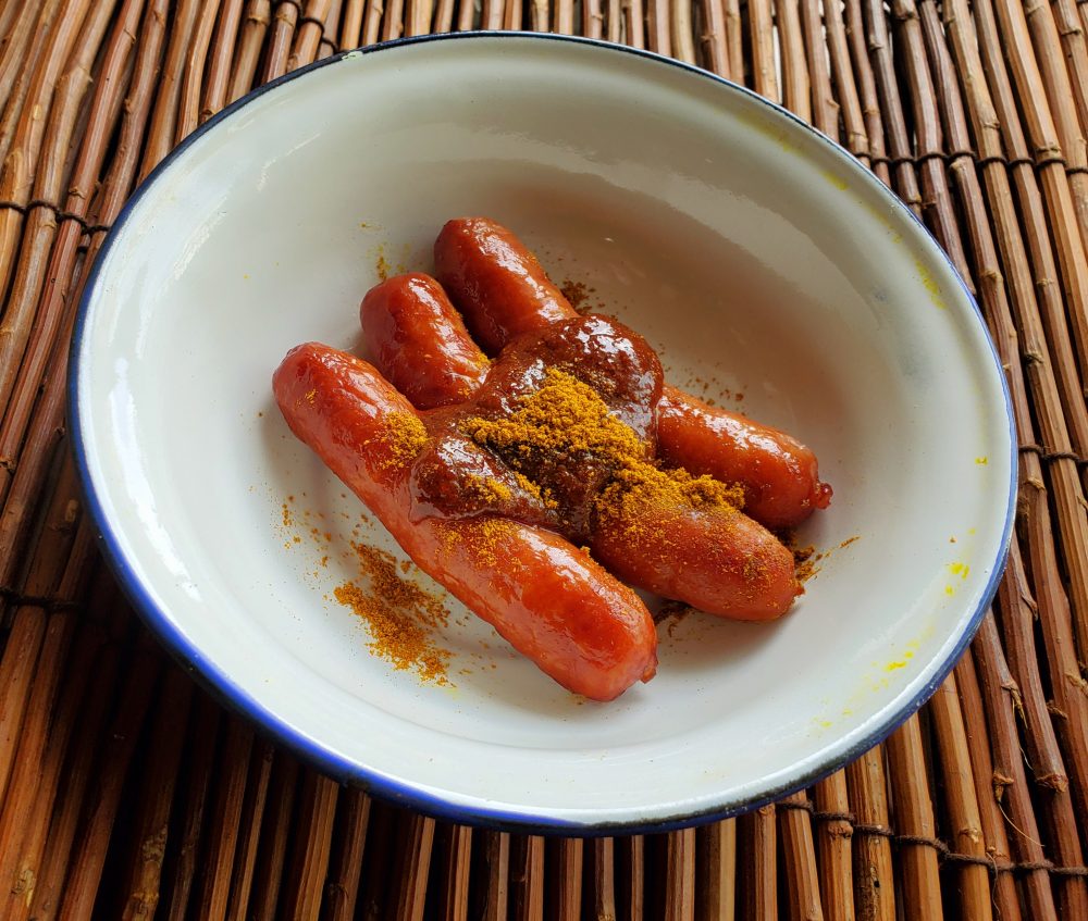 シャウエッセンでもアルトバイエルンでもフランクフルトでも、小型フライパンに少しの水とソーセージを入れ、強火で水を蒸発させ、そのまま炒め続けて焦げ目を軽く付け、ケチャップ・カレー粉を付けながら食べる。