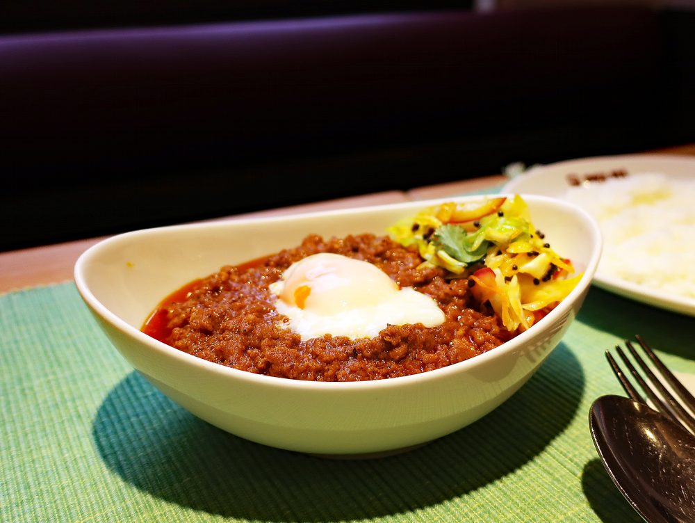 銀座店 3月のカレー「粗挽きキーマカレー 温玉とドライサブジをのせて」